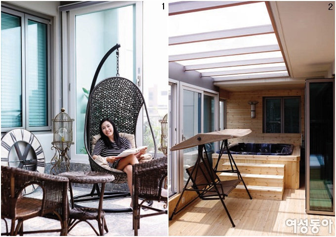 또한 그 옆에는 라탄 소재 테이블과 의자, 아이들이 딱 좋아할 것 같은 그네벤치가 놓여 있고, 거실과 붙어 있는 또 다른 베란다는 분위기 좋은 카페를 그대로 옮겨놓은 것 같다고 합니다.