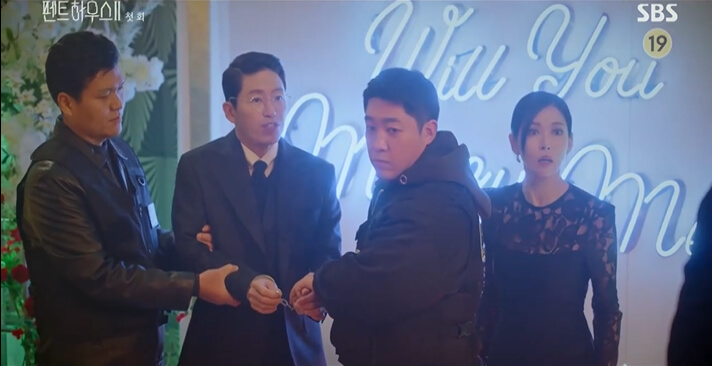 이제 천서진을 저주하는 사람도 없으니 주단태는 천서진에게 프로포즈를 합니다. 그런데 행복한 순간도 잠시 형사들이 와서 주단태를 심수련 살인사건 용의자로 체포합니다.