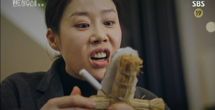 집으로 돌아온 양집사는 천서진의 지푸라기인형을 들고 저주를 퍼붓습니다. 그때 천서진이 나타나고 자신에게 저주를 했던 사람이 양집사인 걸 알게 됩니다. 양집사는 주단태를 사랑한다며 주단태에게 집착하는 모습을 보였고, 이 일로 주단태의 집에서 쫓겨나게 됩니다.