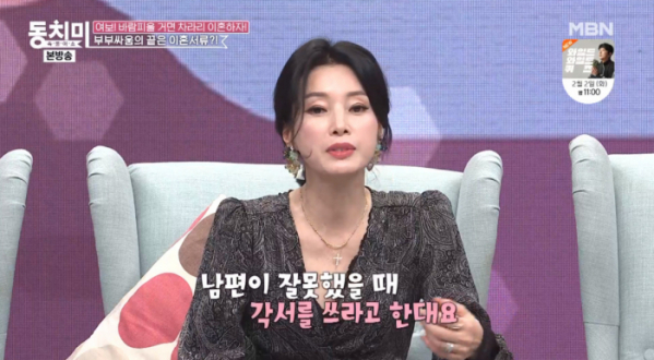 김성희 : "남편이 잘못했을 때 각서를 쓰는데 각서 쓰는 5분만 반성한다고 하더라고요. 그리고 그 습성은 또 나오기 마련인데 죽기 4분 전에 반성하고 죽는다고 해요."