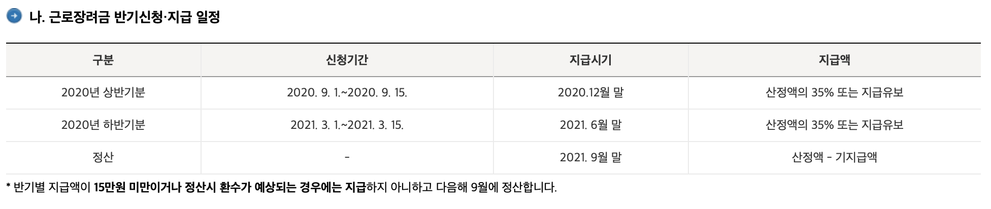 이 단점을 보완하고 장려금 지원의 실질적인 체감도를 높이기 위해, 반기별 소득파악이 가능한 근로소득자에 한하여 당해연도 소득을 기준으로 근로장려금을 반기별로 신청 지급할 수 있도록 2019년부터 시행된 제도입니다.