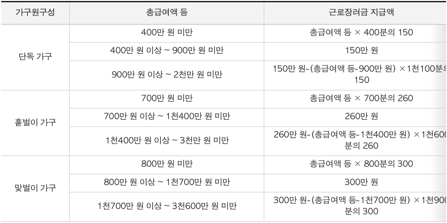 보통 근로장려금 지급액은 단독 가구 150만 원, 홋벌이, 맞벌이 가구 300만 원 이렇게 나와 있어서 150만원이나 300만원 정도 받는 것으로 기대하실 수 있는데요, 하지만 실제로는 근로장려금 산정표에 따라 3만 원에서 300만 원까지 세부적으로 차등해서 지급합니다. 또한 가구원 전체 합계 재산이 1억 4천만 원에서 2억 원 사이인 경우는 산정표 금액의 50%만 지급합니다.