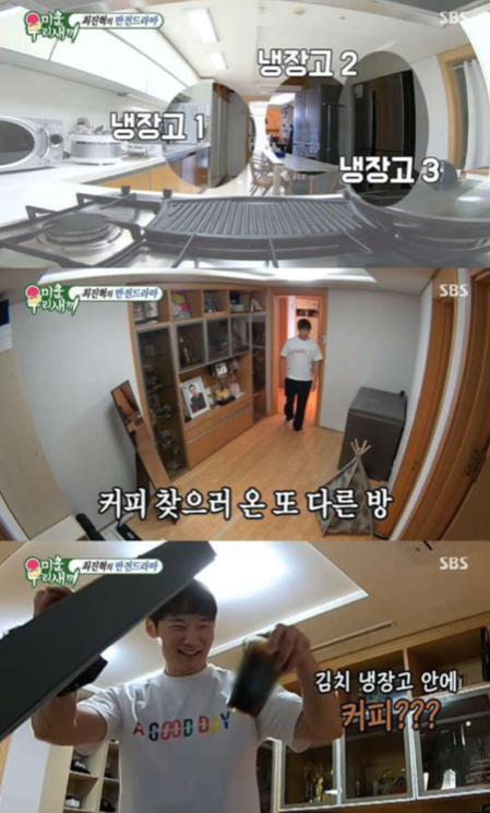 이후 최진혁 집은 찾은 배우 태항호는 침실 헬스장을 보며 "역시 장가를 안가니까 할 수 있는 일"이라며 부러움을 드러냈는데요, 이에 최진혁은 손님 태항호를 위해 또 다른 방에 위치한 김치냉장고에서 아이스커피를 대접하며 일반 냉장고는 얼음이 다 녹아버리는데 김치 냉장고에 넣어두면 얼음이 이틀까지 안 녹는다"고 자랑했습니다.