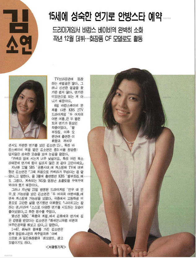 김소연은 그렇게 중학교 때 SBS 공룡선생으로 데뷔, 이후 여러 드라마에 출연해 얼굴을 알렸고, 1998년 시트콤 순풍산부인과에선 오지명의 딸 오소연 역으로 대중에게 이미지를 각인시켰습니다.