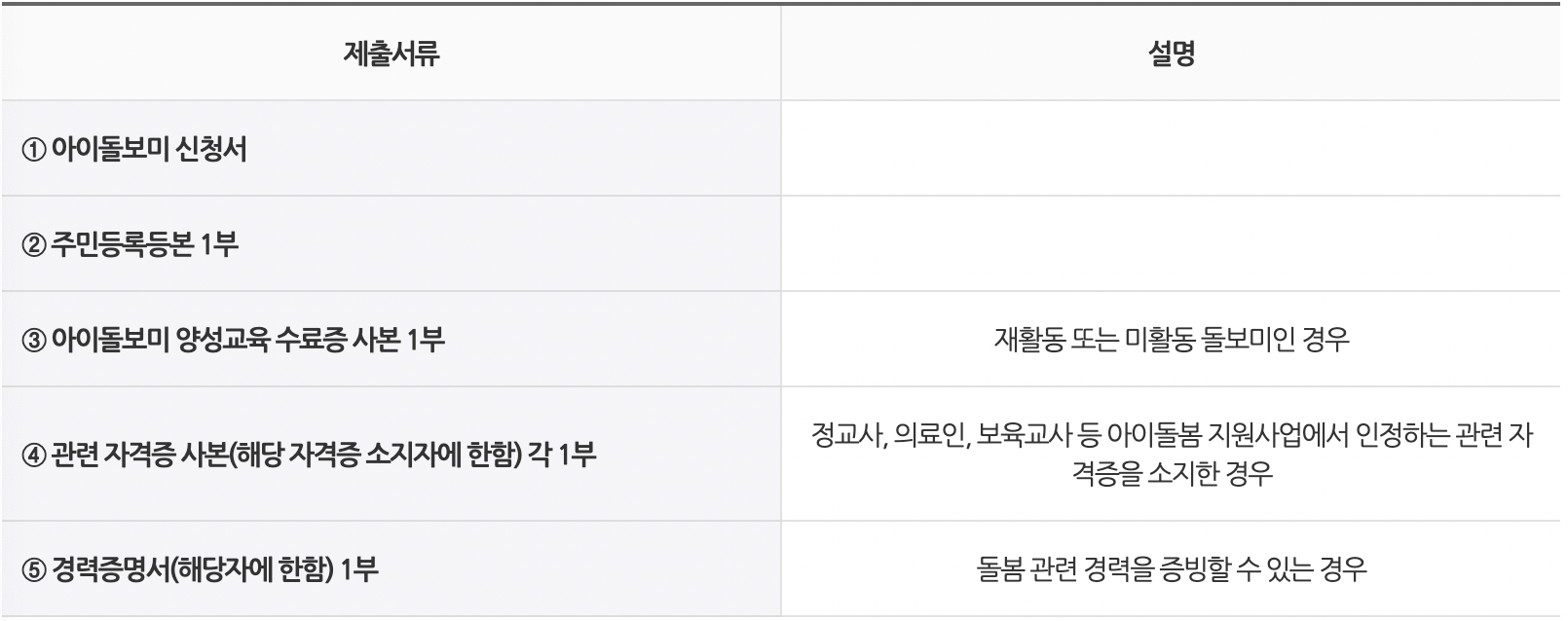 아이돌보미 지원 시 제출서류는 ①아이돌보미 신청서, ②주민등록등본 1부, ③아이돌보미 양성교육 수료증 사본 1부, ④관련자격증 사본(해당 자격증 소지자에 한함) 각 1부, ⑤경력증명서(해당자에 한함) 1부 등이 있습니다.