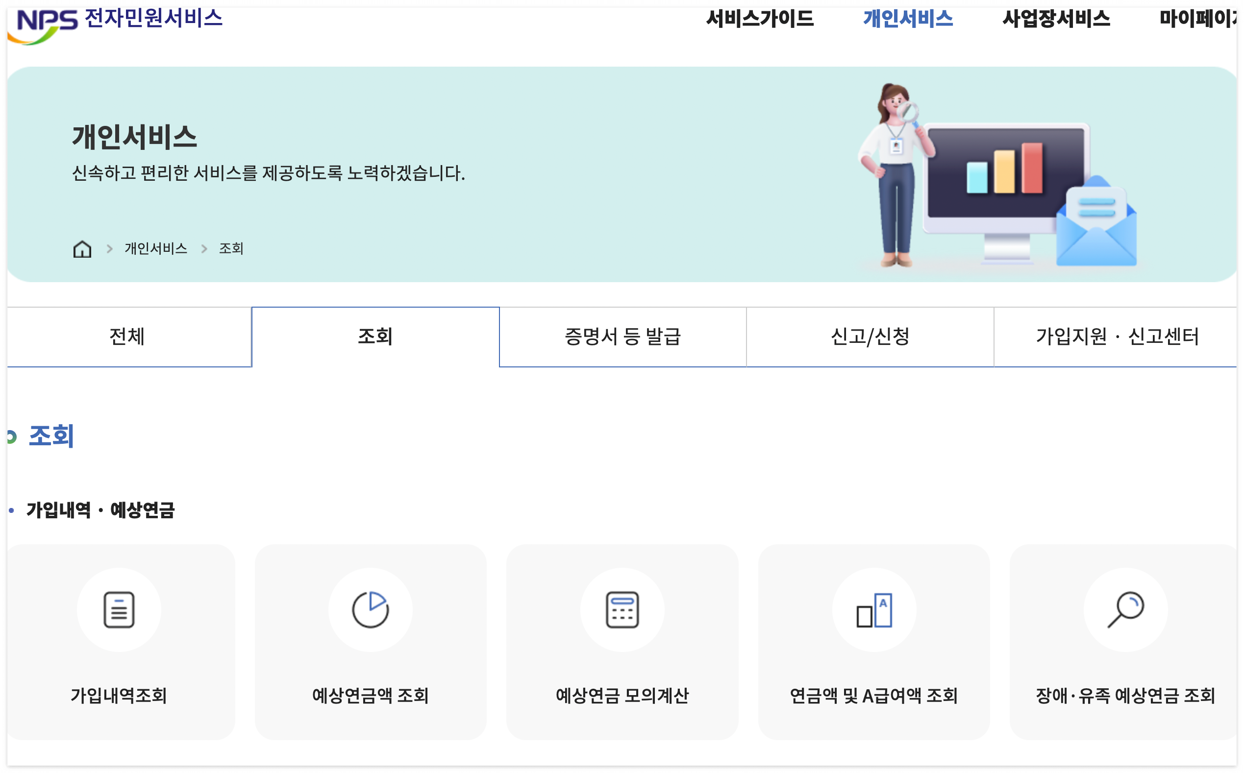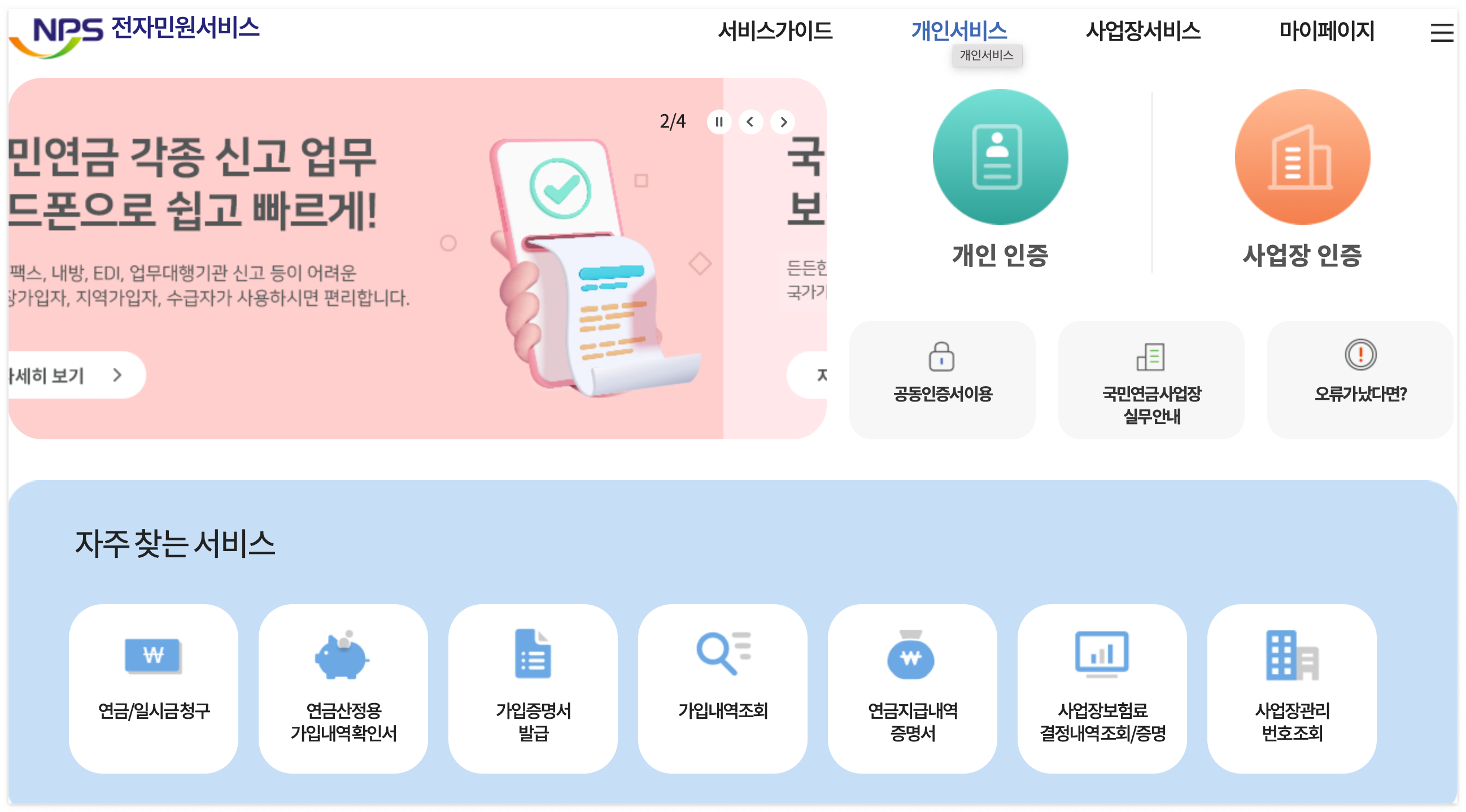 ① 국민연금 전자민원서비스 홈페이지(www.nps.or.kr)에 접속한 뒤 페이지 상단에 위치하고 있는 개인서비스 메뉴를 선택합니다.