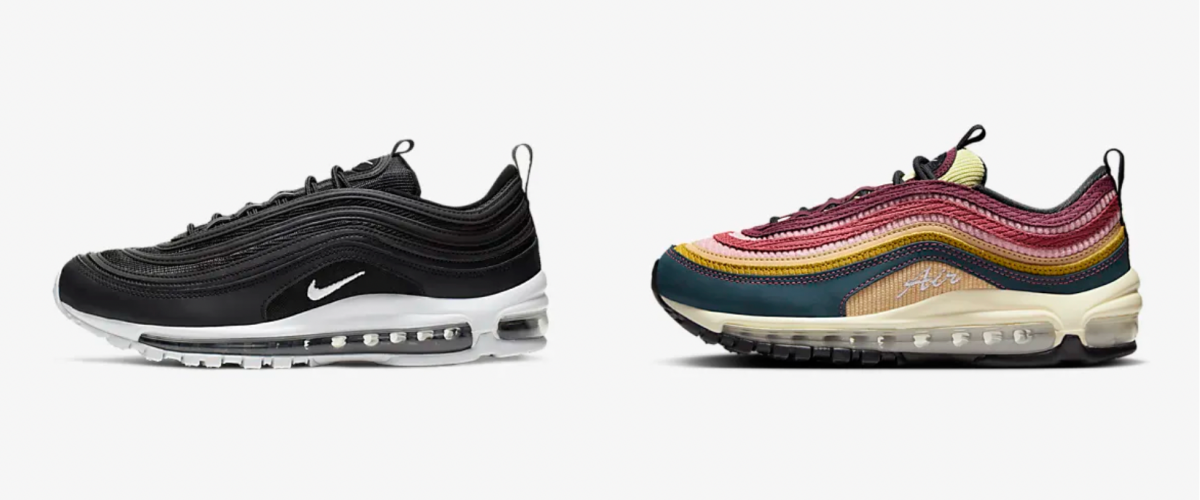 에어맥스 97은 특유의 총알같은 실루엣을 가진 신발로, 일본의 고속열차 신칸센에서 영감을 받아 디자인되었다고 알려지기도 했지만, 사실은 해당 신발을 디자인한 디자이너에 따르면 산악 자전거의 알루미늄 빛깔과 비오는 날의 물웅덩이 이미지가 에어 맥스 97 디자인의 원천이 되었다고 합니다.