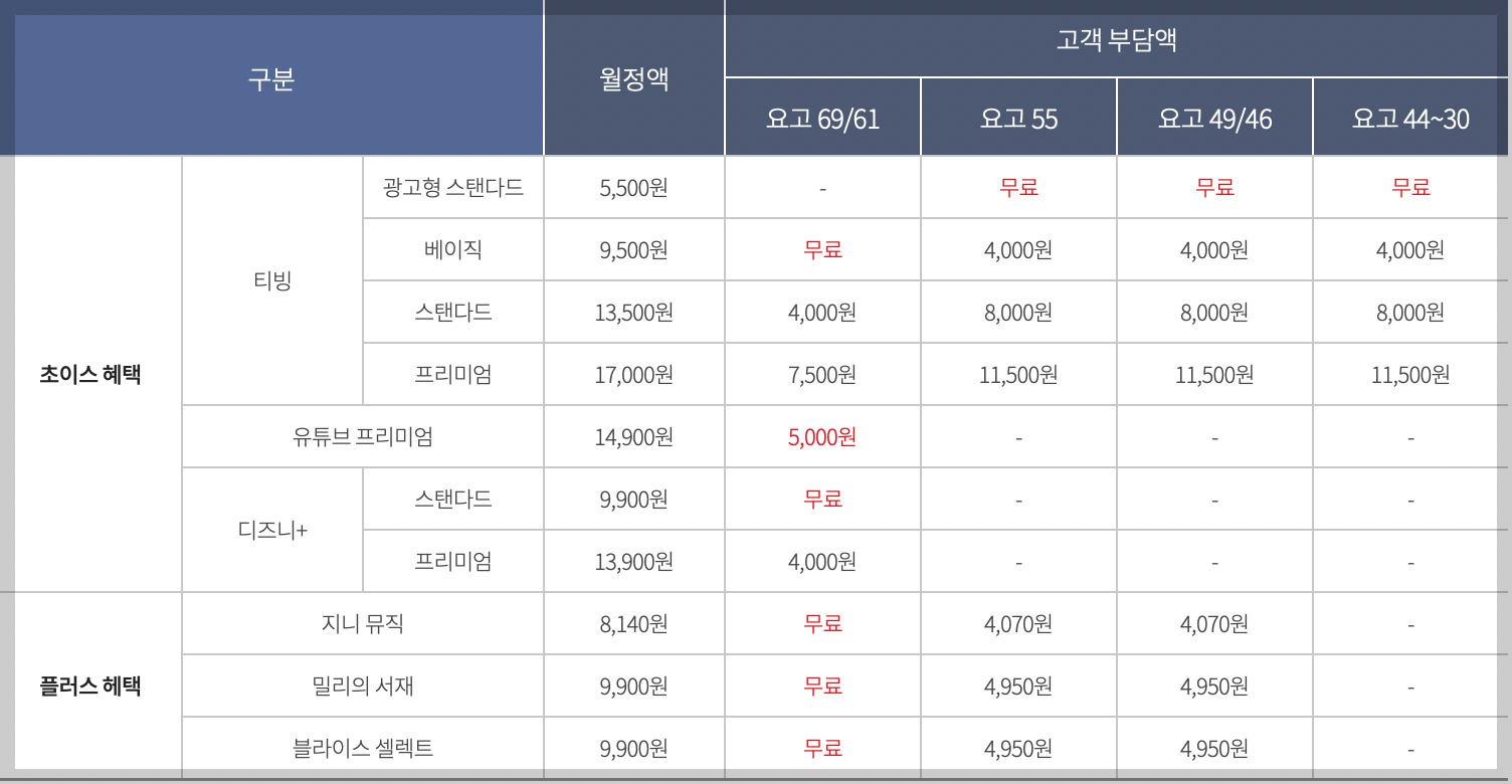 요금제 이름은 티빙/지니/밀리 초이스 요금제로 부가서비스에 포함된 티빙 요금제 혜택에 따라 베이직, 스페셜, 프리미엄 이렇게 3가지로 나누어집니다.