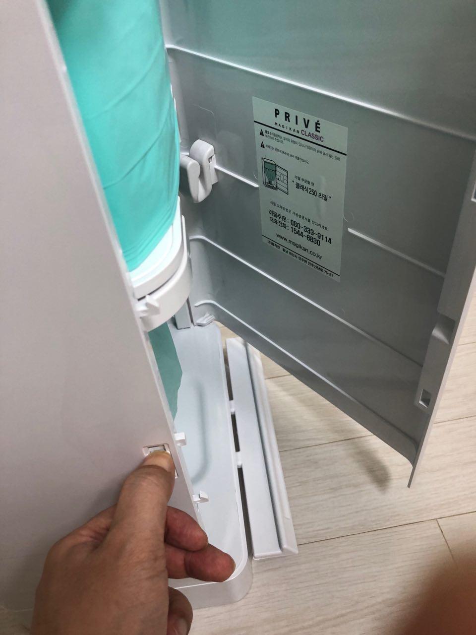 그리고 뚜껑 안에 또 있는 뚜껑은 더블락 시스템으로 잠궈놓으면 열리지가 않으니 경우에 따라 활용하시면 되겠구요, 쓰레기 봉투에 쓰레기가 가득 차게 되면 아래와 같이 앞문 안쪽에 있는 걸이 같은 것에다가 봉지를 걸고 특 뜯으면 되는데요, 안전칼날로 되어 있어서 다치지 않는다니 안심하시구요,