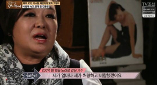 또한 혜은이는 "아파트가 전부 다섯채였고, 현찰만 30억원이었다"고 담담하게 말했습니다. 독한 마음으로 10년 동안 빚을 닾았다는 헤은이는 "돈이 되는 일은 뭐든지 다 했어야 했다. 그때는 방송도 못했다. 방송을 하면 시간을 많이 뺐겨서 돈 버는 일을 못하기 때문에"라며서 "아침에도 어디서 노래를 하라 그러면 노래를 했어야 했고, 드레스 하나 해 입을 돈을 안주더라"고 말했습니다.